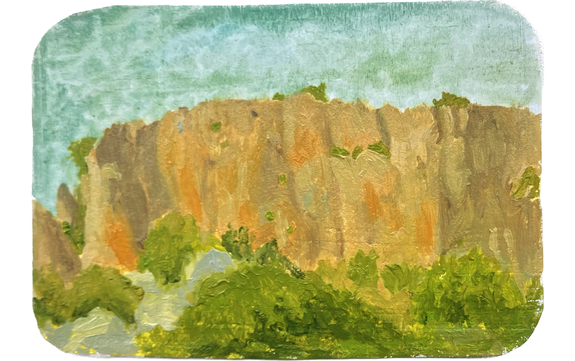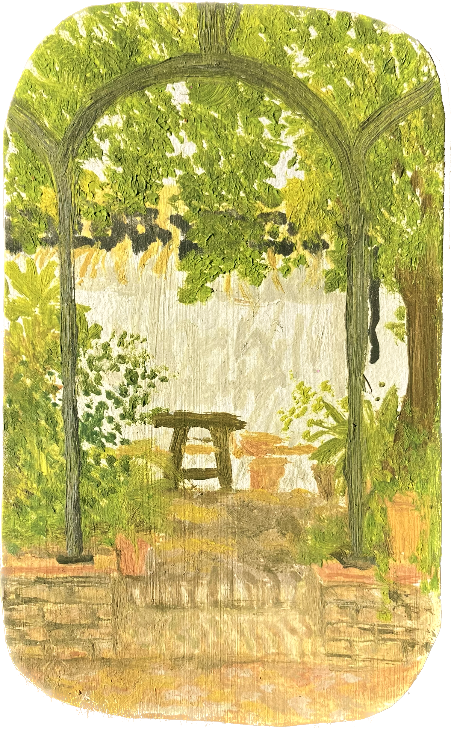 Pintura al natural de óleo sobre cartón imprimado con gesso. Los lienzos los he hecho de la medida de la cajita de óleos por lo que tienen un tamaño de  unos 8,7 x 5,8 cm y las puntas redondeadas.
